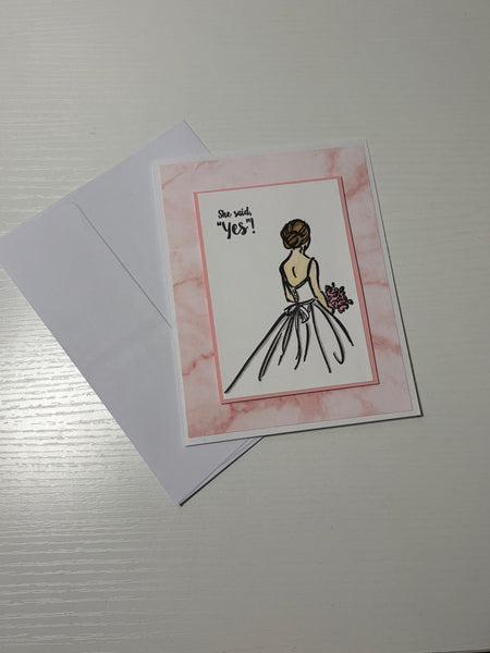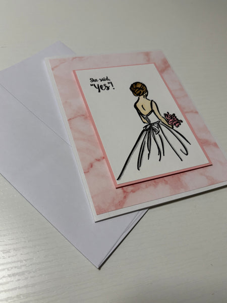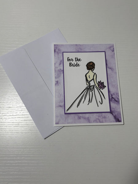 The perfect card for a bridal shower. Each card is hand-stamped and coloured. The image is raised three dimensionally on the marble background design.  The card is blank inside for your own message and comes with an envelope.