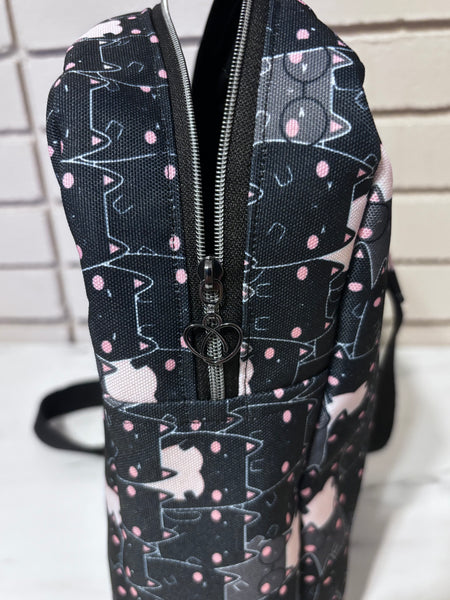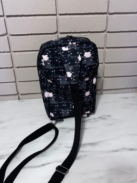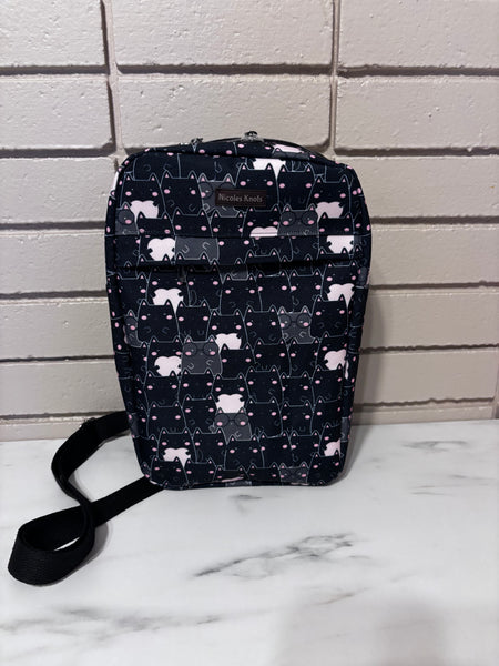 This sling over the shoulder bag is perfect for on the go! Use it as a purse or for travel. It holds quite a bit in it! Fit a book, water bottle, wallet, etc! The possibilities are endless.