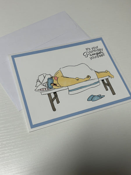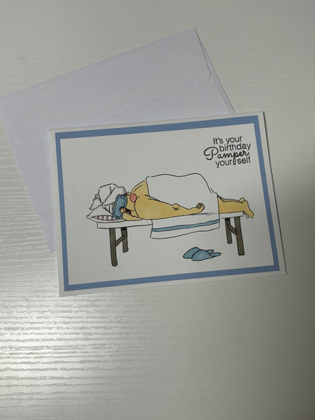 Wish them a relaxing happy birthday! The card is hand stamped and coloured. The inside of the card is blank for you to write your own personal message.